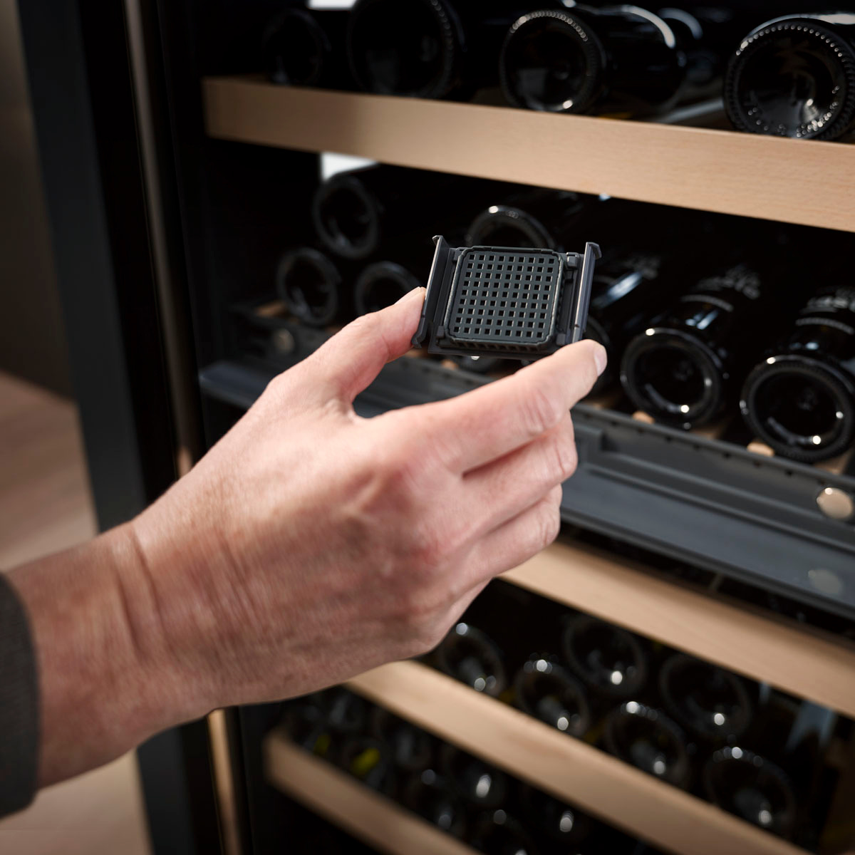 Všetky chladničky na temperovanie vín Liebherr majú filter z aktívneho uhlia, ktorý odstraňuje pachy akéhokoľvek druhu a zároveň sa stará o to, aby vaše víno dozrievalo pri optimálnej kvalite vzduchu. Vaše víno si tak zachová čistý buket. A aby to tak zostalo aj naďalej, váš model Liebherr vás každých 6 mesiacov upozorní, aby ste filter vymenili, čo ľahko zvládnete aj sami.